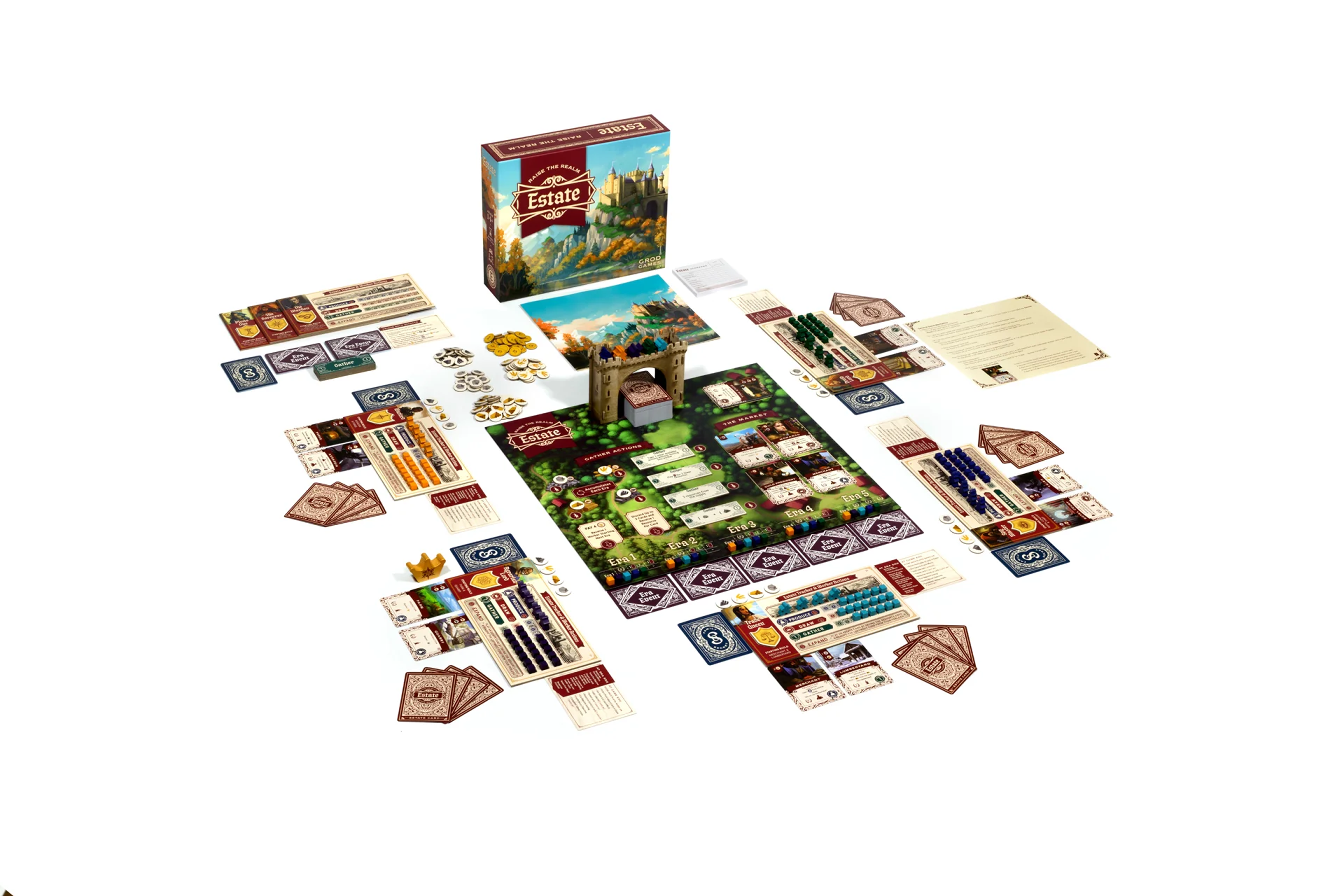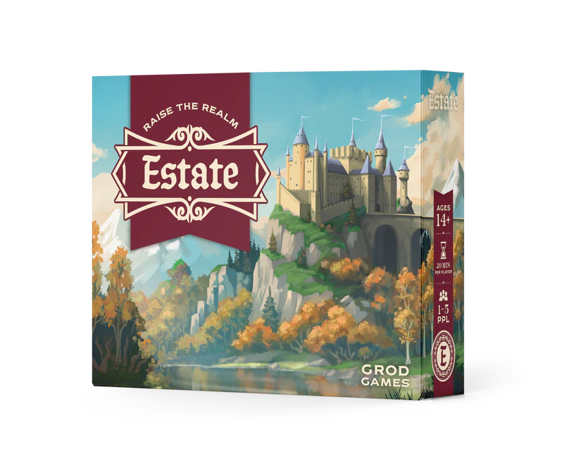 In Estate: Raise the Realm, players take on the role of a Noble Leader of a Great House who is bequeathed an Estate post war. Each Leader begins the game with resources, a special ability, a unique build of construction(s) and/or citizen(s) cards within their Estate, a Family Secret objective, and workers prepared to rebuild.