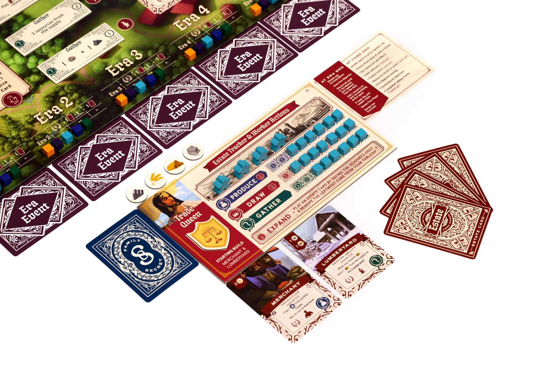 A worker placement reconstruction challenge, players must use their workers wisely to optimize their Estate’s growth over the five Eras of game play. Workers can be used to play cards, gather resources, produce on cards, and draw new cards. As the Eras progress and your Estate grows, worker actions become more powerful.