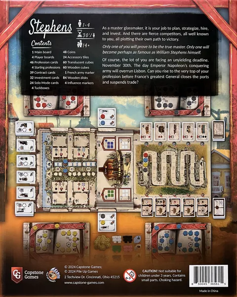 In Stephens, players compete amongst one another in the role of master glassmakers working at the famous “Stephens” Factory to become the most prestigious figure in town…after Stephens, of course. Through clever and cunning planning, all players will develop their works, invest in new businesses, and promote the creation of jobs. Through a unique action-selection mechanism, on their turn players choose from a variety of options, either by activating the Stephens factory or by activating one of their personal investments.